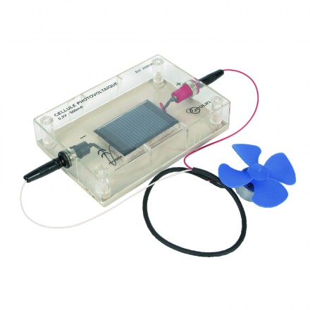 L’ensemble est livré avec un petit moteur que vous ferez fonctionner simplement en éclairant la cellule avec une lampe de 75 W, mettant ainsi en évidence la transformation de l’énergie solaire en courant électrique.