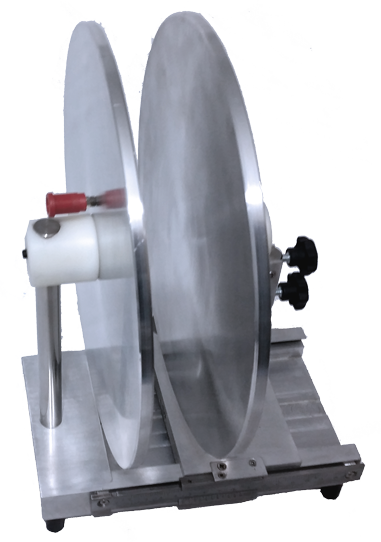 Le dispositif est constitué de deux plateaux circulaires en aluminium formant un condensateur à armatures parallèles et d’épaisseur variable.