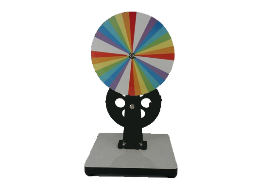 Le Disque de Newton est un outil pédagogique classique utilisé pour démontrer le principe de la synthèse additive des couleurs. Ce disque est divisé en segments colorés représentant les couleurs du spectre lumineux (rouge, orange, jaune, vert, bleu, indigo, violet). Lorsqu’il est tourné rapidement à l’aide de la poignée manuelle, les couleurs se mélangent optiquement pour former une couleur blanche