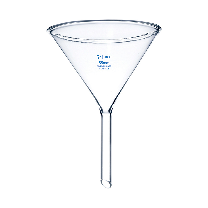 Entonnoir « plain short stem » en verre borosilicaté 3.3 (USP Type I), diamètre 55 mm, tige courte 55 mm, angle de cuve 60°, conforme aux normes IS 1591 / DIN ISO 4798.