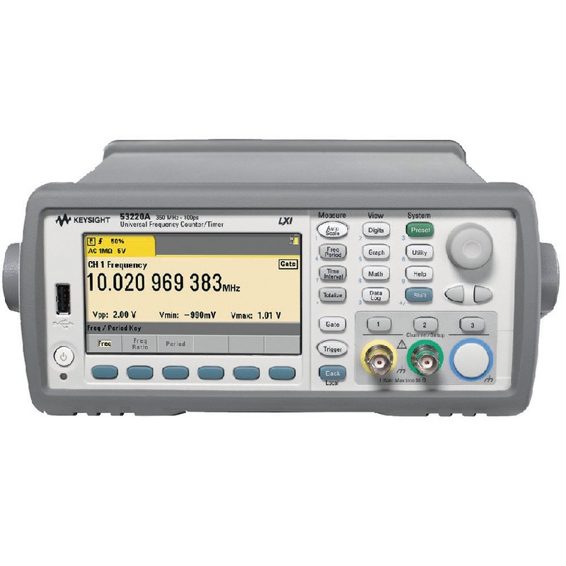 Keysight 53220A est un compteur qui permet les mesures de fréquence, du ratio de fréquence, de l’intervalle de temps, de la période, du temps de montée/descente, de la largeur de l’impulstion, de la phase (CH1 à CH2), de la tension maximale, de la moyenne de l’intervalle de temps et le retard de l’intervalle de temps etc. 12-digit par seconde et la bande passante est de 350 MHz. Avec l’option 010, qui permet la base de temps OCXO de ultra haute stabilité.