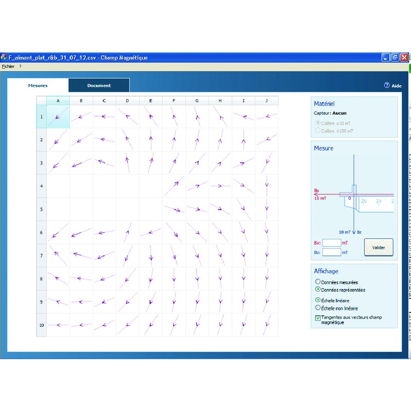 Ce logiciel en trois parties permet l’acquisition et la représentation 2D d’un champ magnétique. À l’aide d’un capteur Teslamètre et d’un aimant de forme quelconque, mesurez le champ magnétique et affichez ses deux composantes, en x et en y, sous forme numérique mais aussi sous forme graphique par une représentation vectorielle 2D.