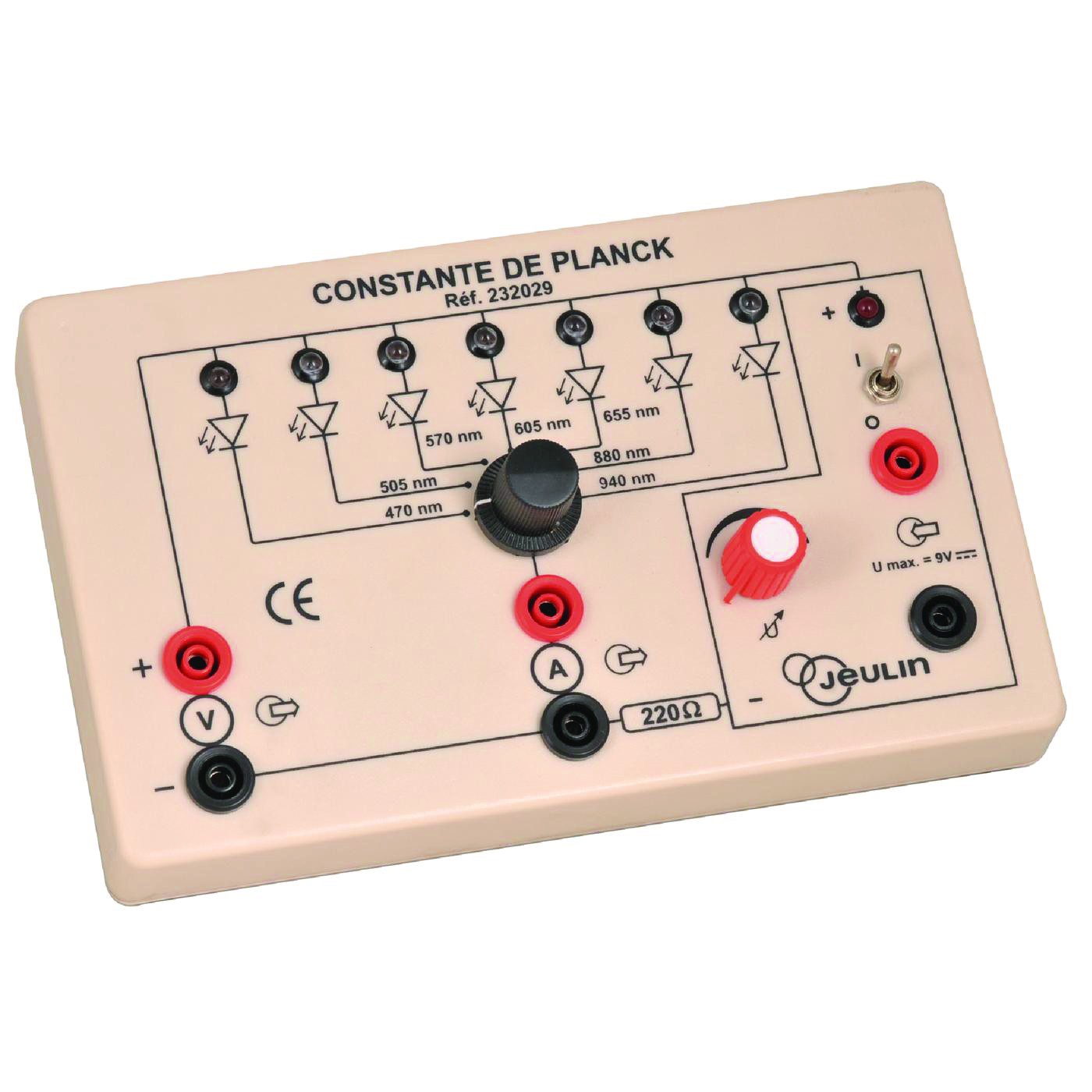 Par tracé des caractéristiques de chacune des LEDs, on obtient leurs tensions seuils d’allumage. Puis, par bilan énergétique entre énergie lumineuse et énergie électrique, la constante de Planck est mise en évidence.
