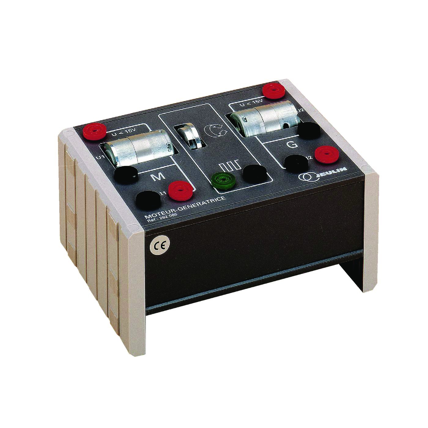 – 2 moteurs dont 1 fonctionnant en génératrice : valeurs nominales : tension 12 V, vitesse de rotation à vide : 12 000 tr / mn, protection contre les surtensions. Dispositif de mesure de la vitesse commune de rotation à l’oscilloscope ou au fréquencemètre.