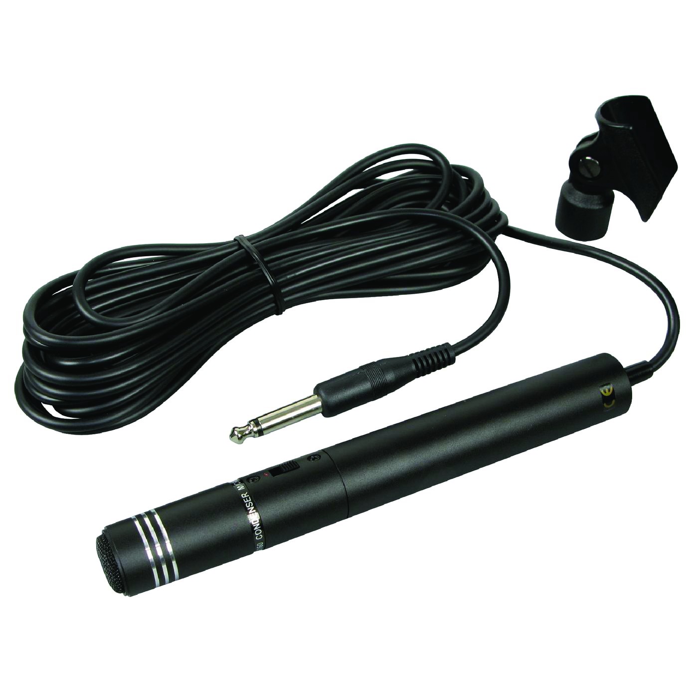 Microphone omnidirectionnel à électret large bande fourni avec clip de fixation pour pied microphone.
