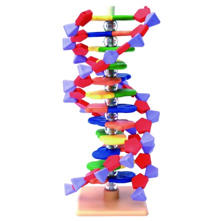 D’une hauteur de 22 cm, les formes et couleurs des différents éléments (bases azotées, sucres et phosphates) permettent de repérer chaque élément et de reconstituer la structure de la molécule d’ADN.