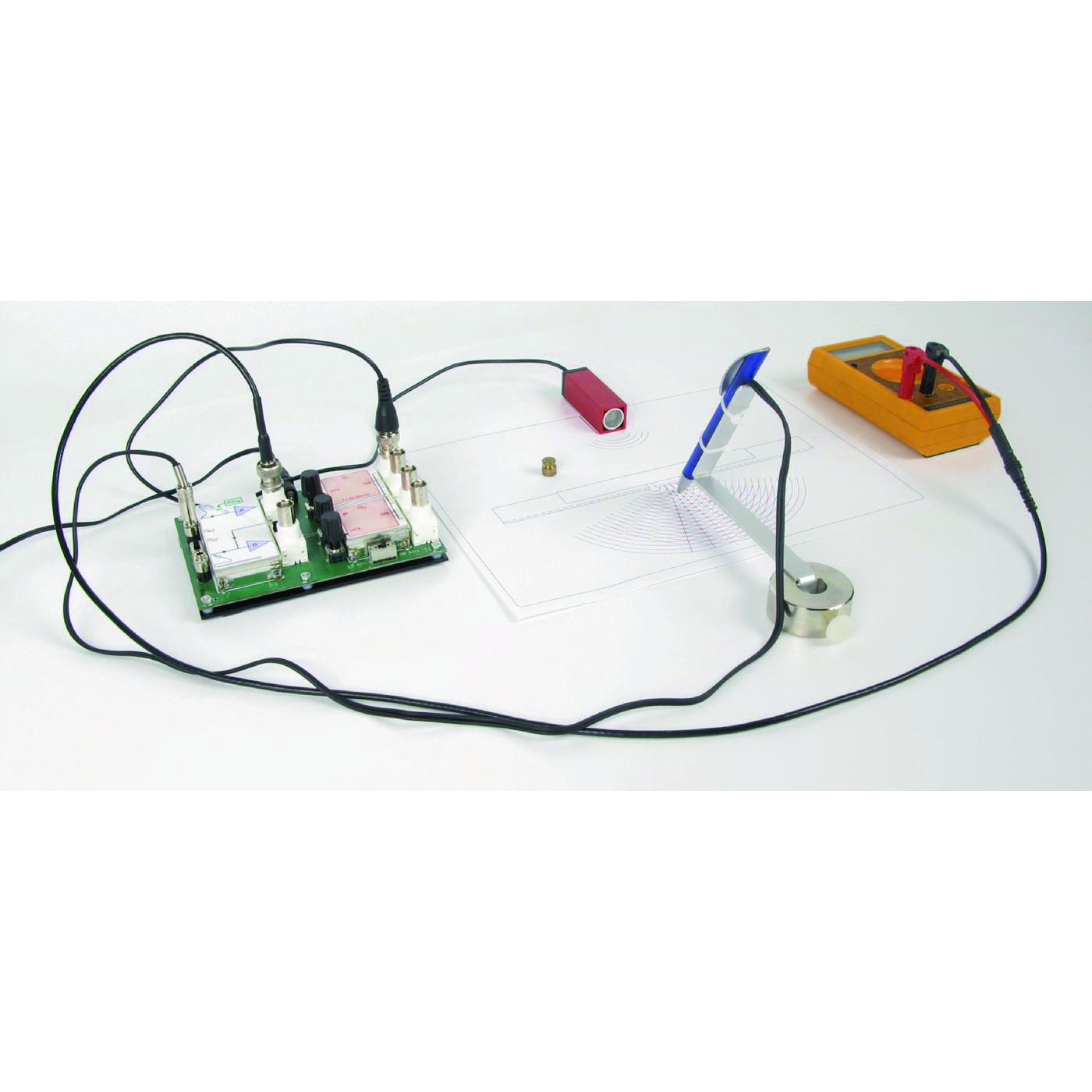 Les émetteurs et récepteurs ultrasoniques à 40 kHz, associés aux nombreux accessoires fournis permettent à l’aide des sondes de tracer la cartographie du champ acoustique. Une de ces sondes possède une fonction d’affichage à LED permettant de déterminer la phase par rapport à un point de mesure sélectionné dans le but de tracer des fronts d’ondes de même valeur de phases (isophases)