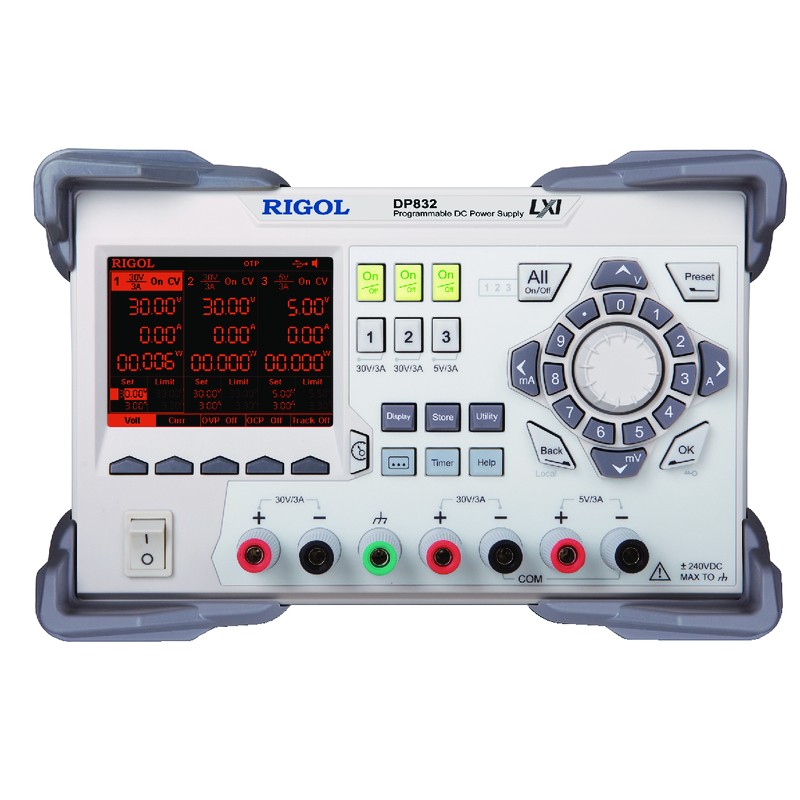 L’alimentation Rigol DP832 est une alimentation programmable de laboratoire haute performance disposant de 3 sorties DC linéaires (30V/3A, 30V/3A, 5V/3A) avec une puissance de sortie maximale de 160W et un écran (8,9 cm/ 3,5”) TFT couleur. Cette alimentation Rigol dispose des meilleures fonctionnalités, avec une sensibilité minimum au bruit, une protection contre la surchauffe ainsi qu’une interface ergonomique permettant de programmer avec facilité les courbes de tension.