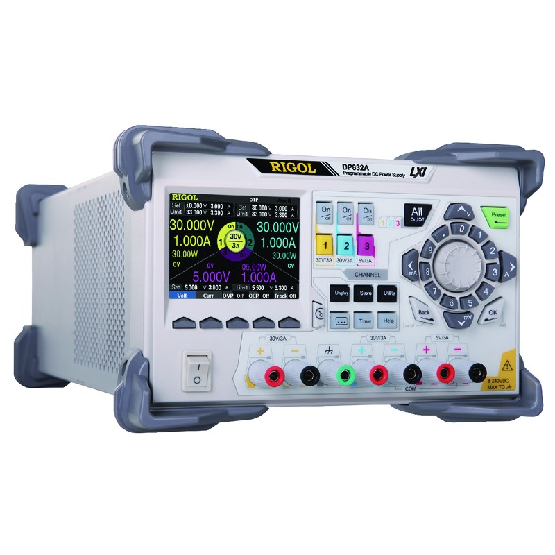 L’alimentation Rigol DP832A est une alimentation programmable de laboratoire haute performance disposant de 3 sorties DC linéaires (30V/3A, 30V/3A, 5V/3A) avec une puissance de sortie maximale de 195W et un écran (8,9 cm/ 3,5”) TFT couleur. Cette alimentation Rigol dispose des meilleures fonctionnalités, avec une sensibilité minimum au bruit, une protection contre la surchauffe ainsi qu’une interface ergonomique permettant de programmer avec facilité les courbes de tension.