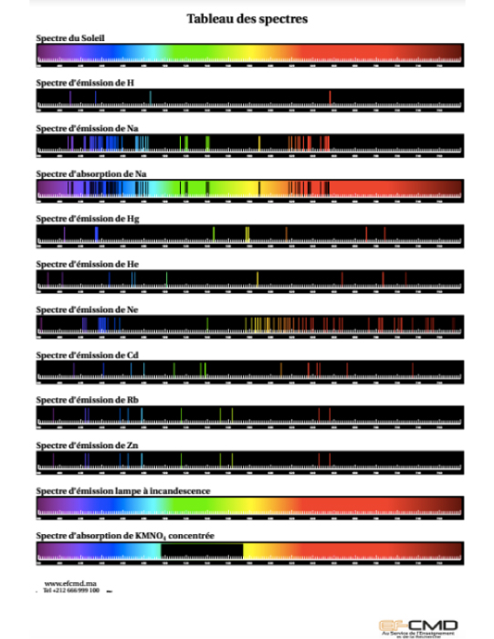 Tableau présente les spectres continus ou de raies, absorption et d’émission de plusieur sources de lumière.